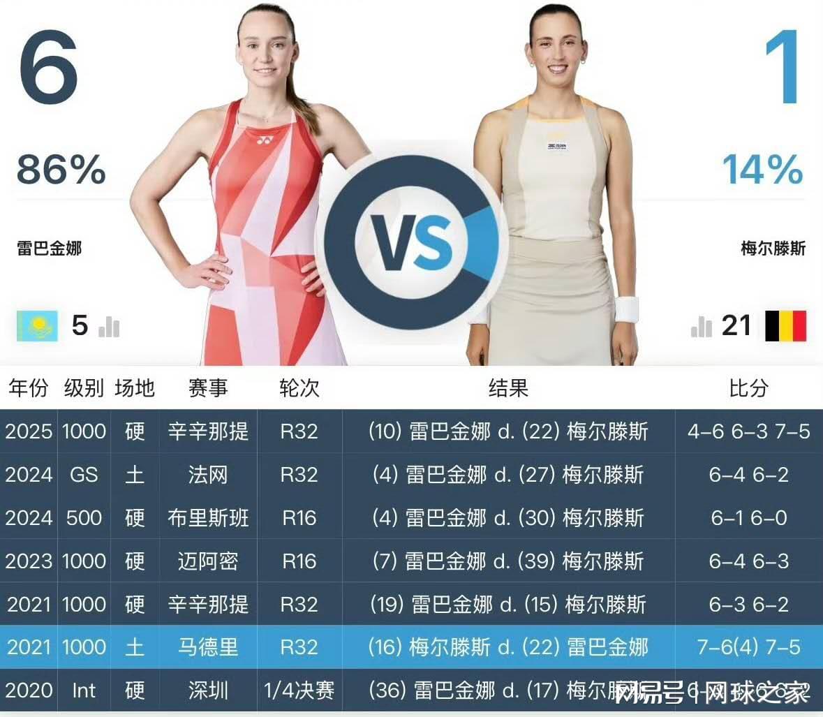从交手记录来看:双方此前有过7次交锋,莱巴金娜以6胜1负占据绝对优势。最近一次是在2025年辛辛那提站,莱巴金娜经过三盘激战以2-1获胜。